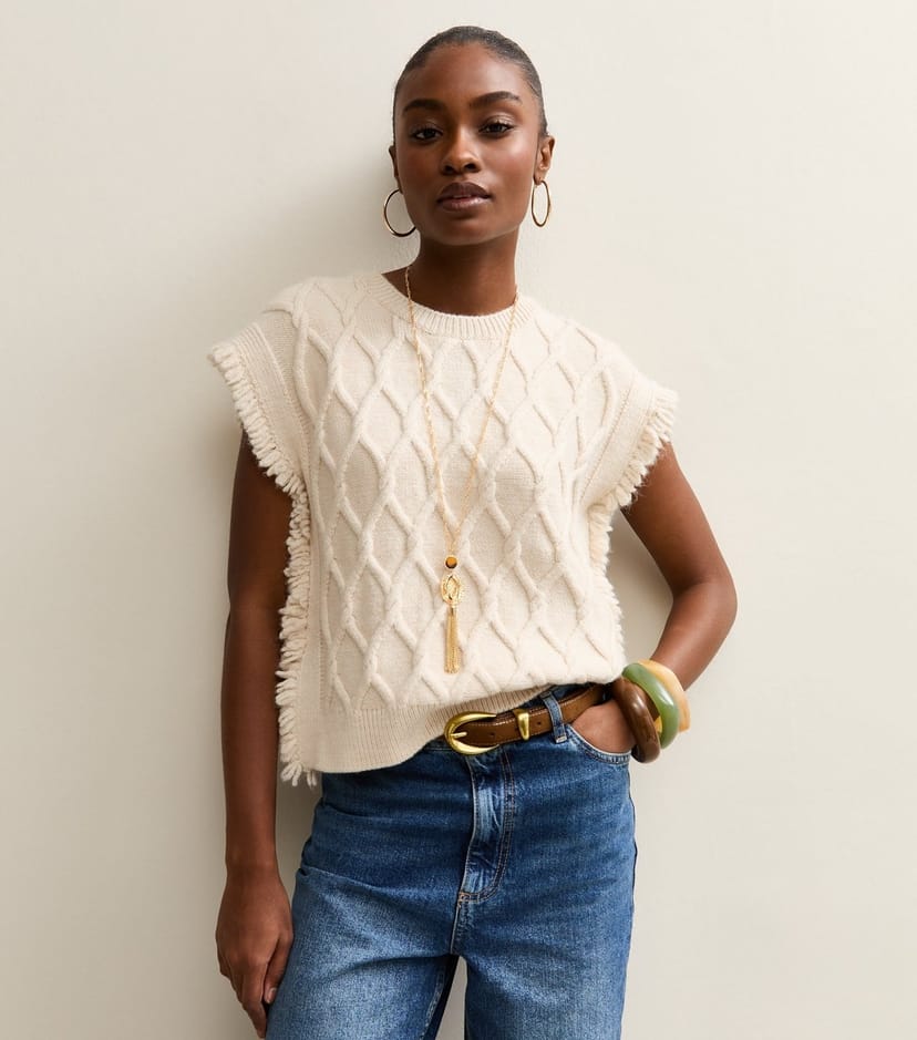 The New Look Cream Cable Knit Sleeveless Jumper is available in sizes l.