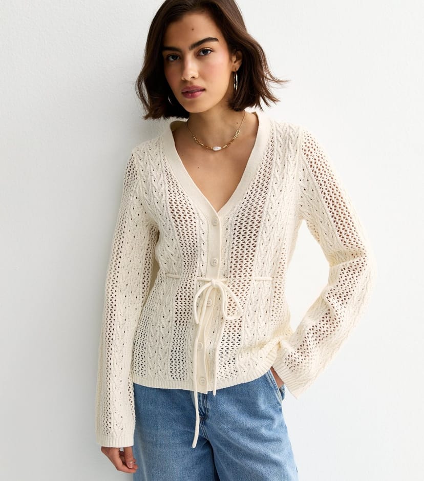The New Look Cream Cotton Rich V-Neck Tie Waist Cardigan is available in sizes 10, 12, 14, 18, 6, 8.