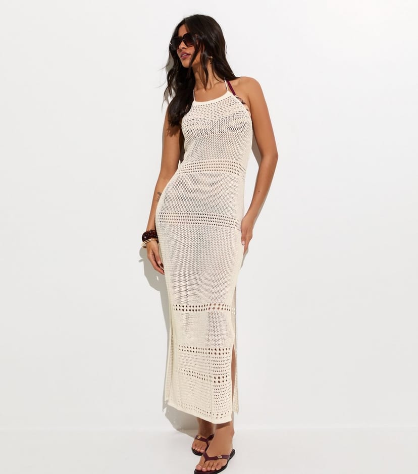 The New Look Cream Crochet Halter Neck Beach Maxi Dress is available in sizes 12, 14, 16, 18.