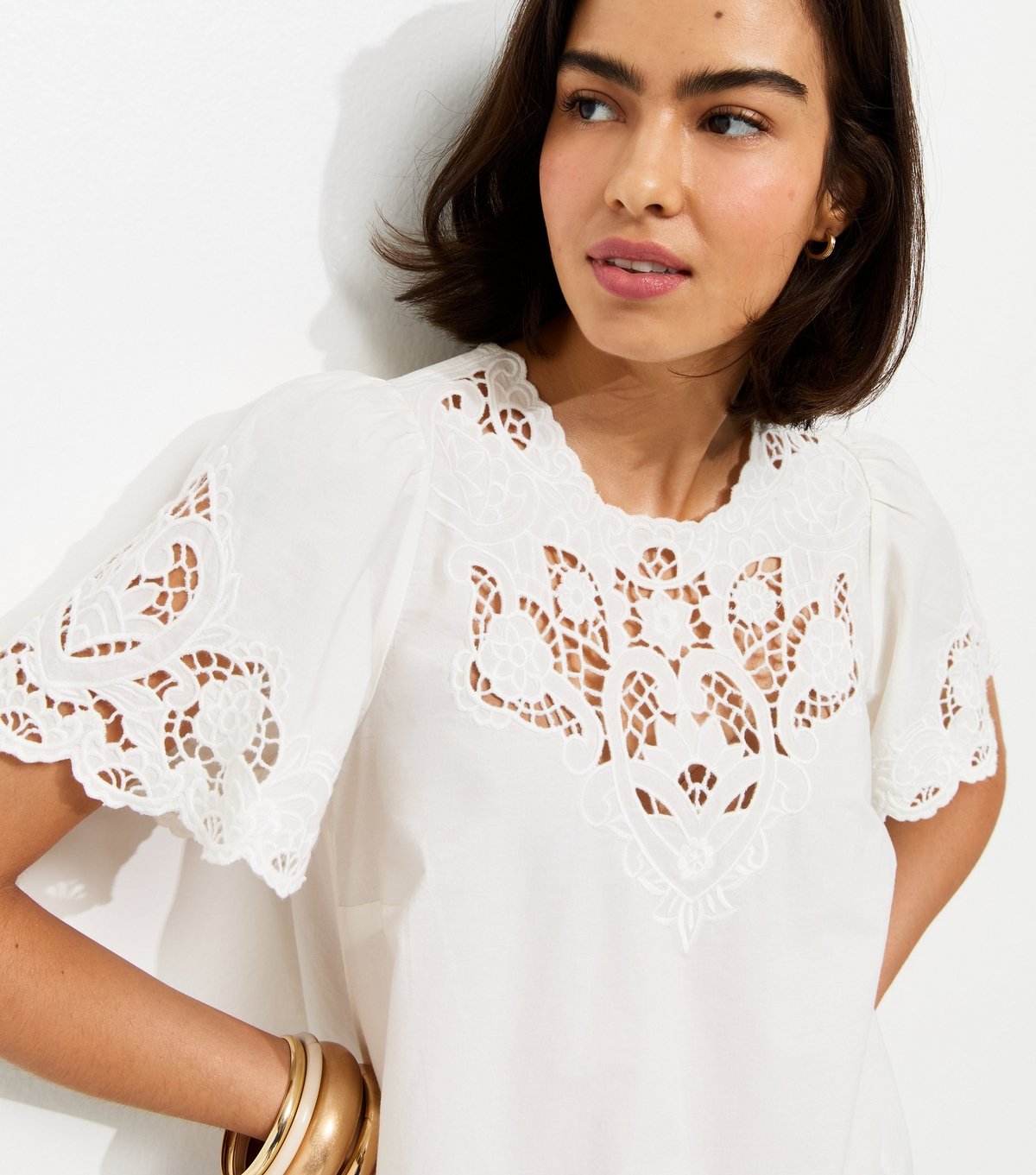 The New Look Cream Cutwork Embroidered Scallop Edge T-Shirt is made from woven.