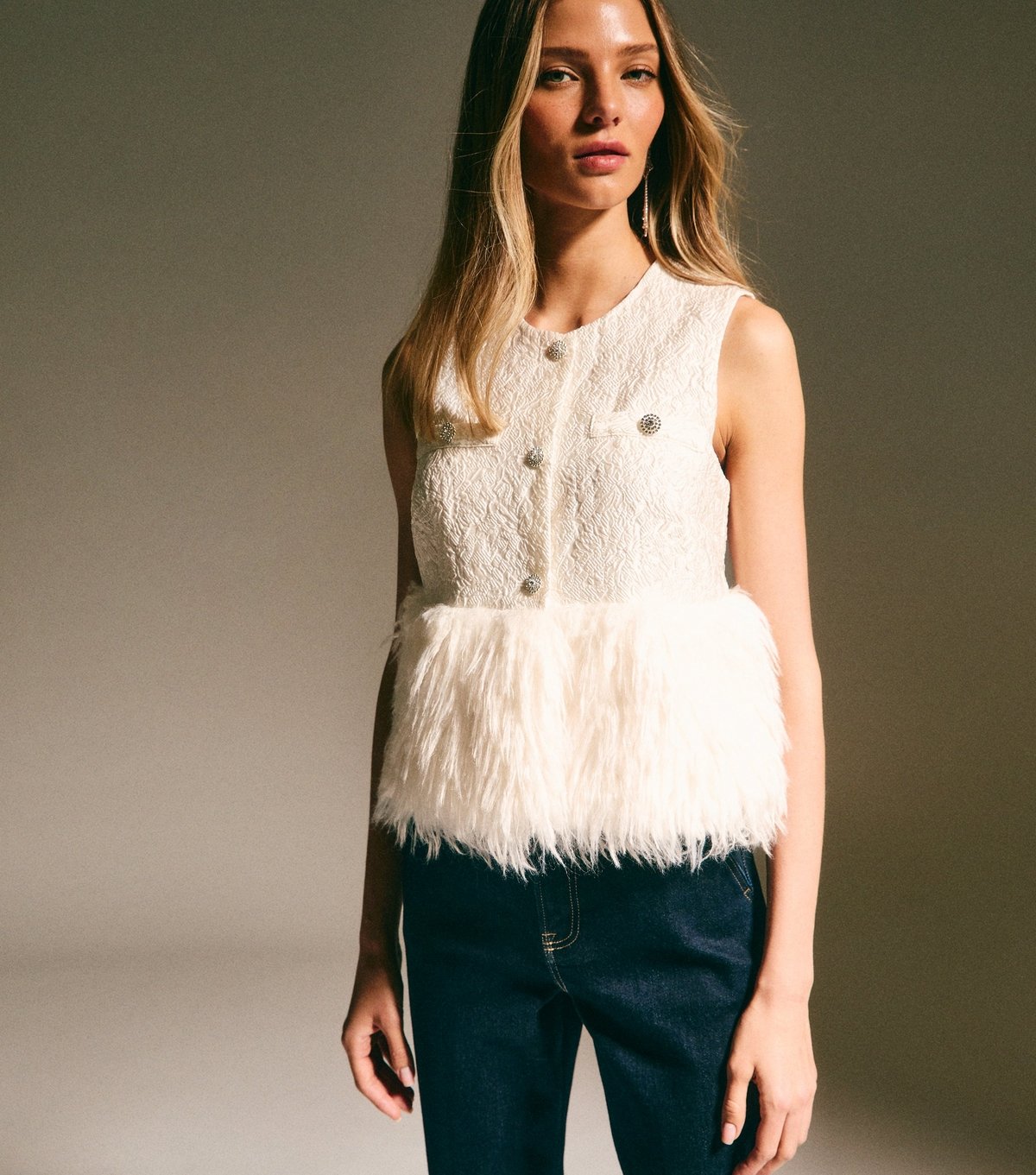 Elegant sleeveless top perfect for evening wear. Featuring a cream woven textured jacquard fabric with a fluffy faux-fur hem and diamanté buttons. A fitted, short-length top that adds glamour to any outfit.