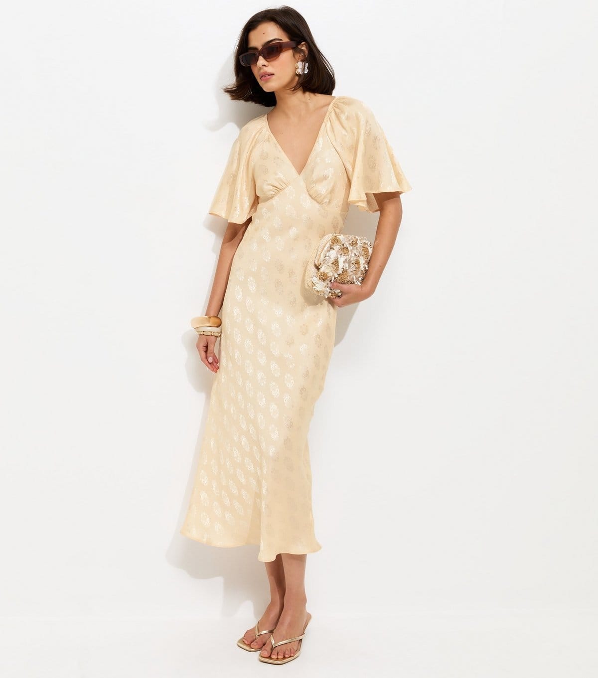 Effortlessly sophisticated, this cream midi dress features butterfly sleeves for a romantic elegance. With its flattering V-neckline, the dress fastens with a back neck tie that frames the V-back.
