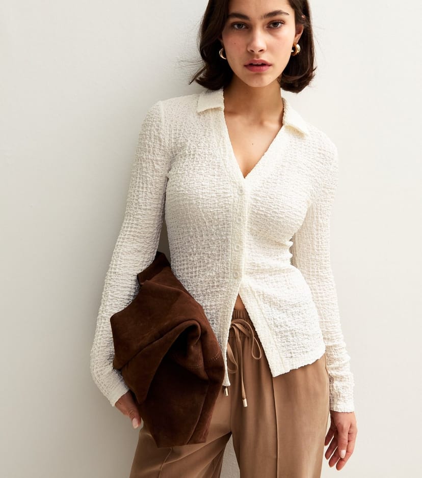 View New Look UK's returns policyThis cream textured jersey top features a collared V-neckline and long sleeves. It's a smart casual staple perfect for everyday wear. Made from textured jersey, it offers a slim fit for a flattering look.
