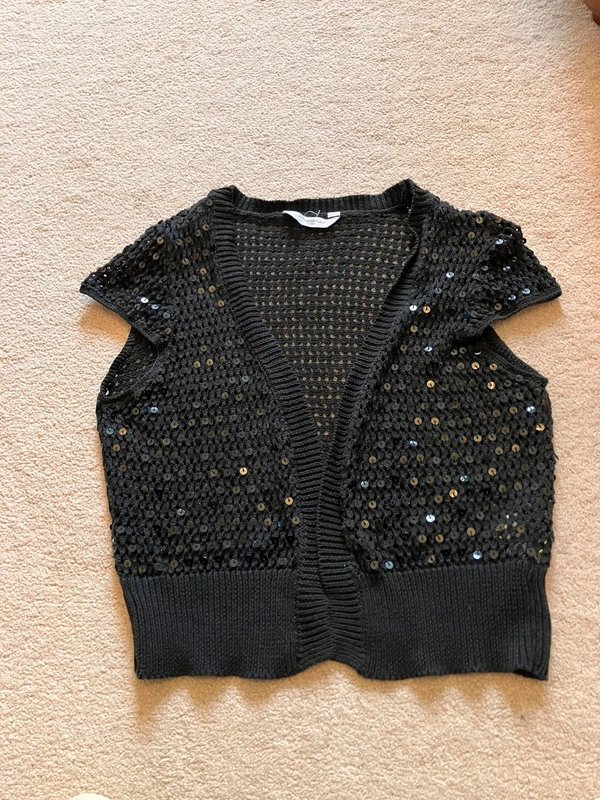 This cute cropped black, short-sleeve, open-front, crochet-knit bolero cardigan is embellished with sequins. Size medium but comes up small. Perfect for adding a touch of sparkle to your outfit.
