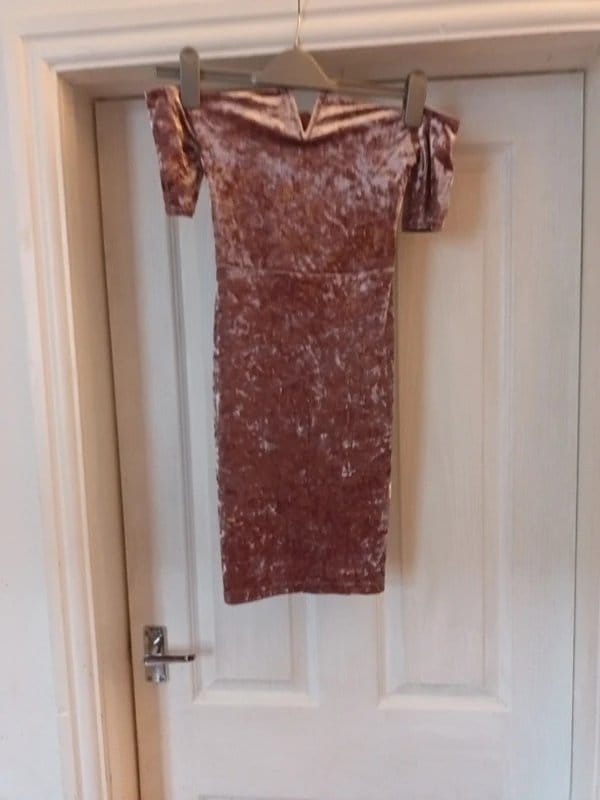 The New Look Dusty Pink Crushed Velvet Off-Shoulder Dress is available in sizes S.