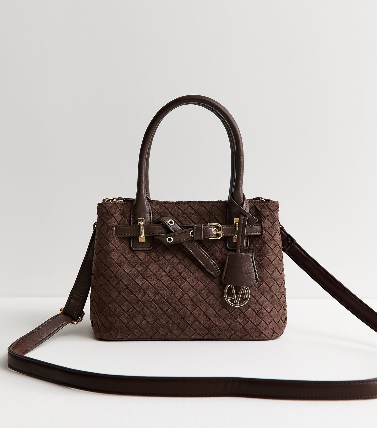Stylish mini crossbody bag in brown faux suede with a weave-effect front. Features a belted trim and adjustable strap for versatile wear. Perfect for everyday use.