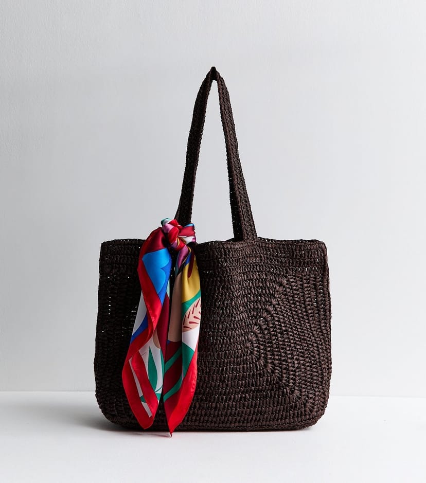 The New Look Chocolate Oversized Woven Tote with Scarf is ideal for beach, market, casual.