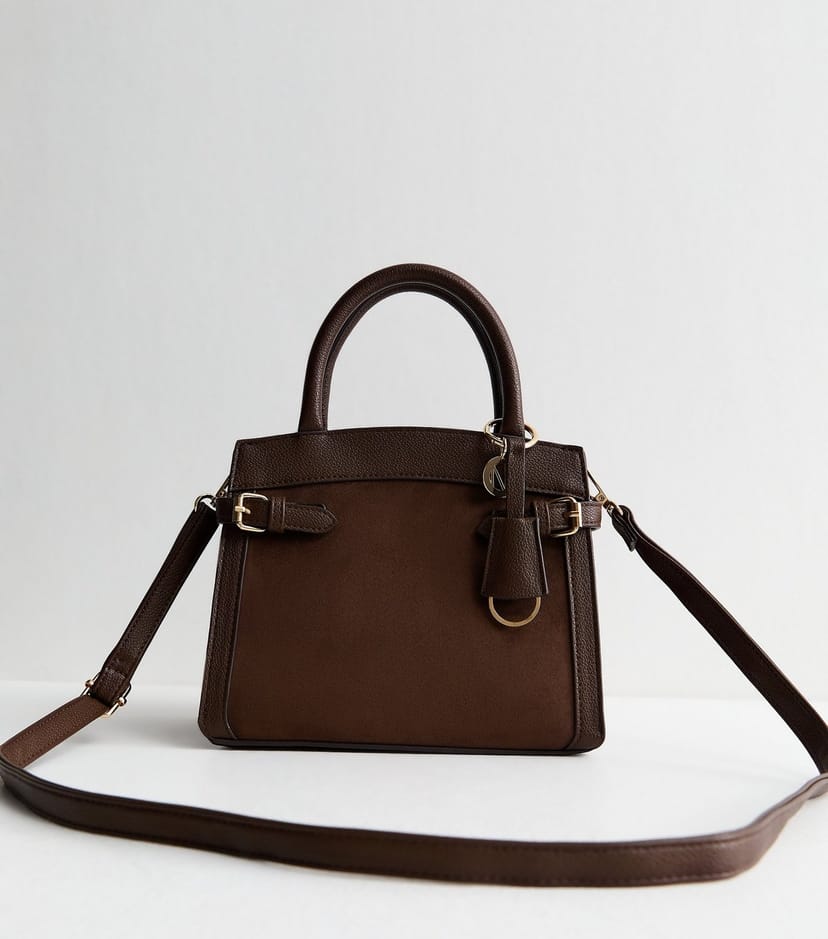 Versatile dark brown faux suede tote bag from New Look. Features a sleek, boxy structure with a buckle and logo charm. Perfect for everyday use or special occasions.