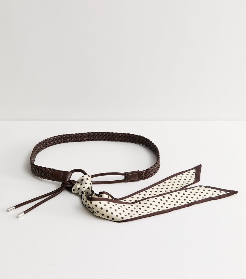 View New Look UK's returns policyThis dark brown plaited belt features a playful polka dot scarf for added flair. It fastens with a tie looped through a casual ring. Perfect for a casual yet stylish look.