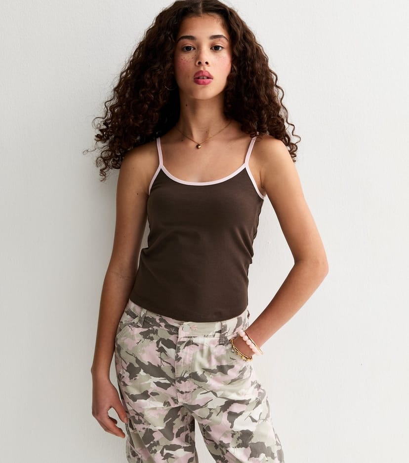 This dark brown jersey cami top by New Look features a scoop neckline and light pink trim. It's a slim fit and short length, perfect for layering over jeans.