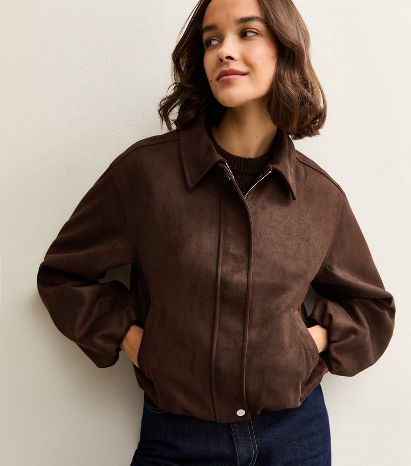 View New Look UK's returns policyElegant brown faux suede jacket with a bubble hem for a touch of warmth. Featuring a collared neckline and boxy fit, this jacket is perfect for layering.