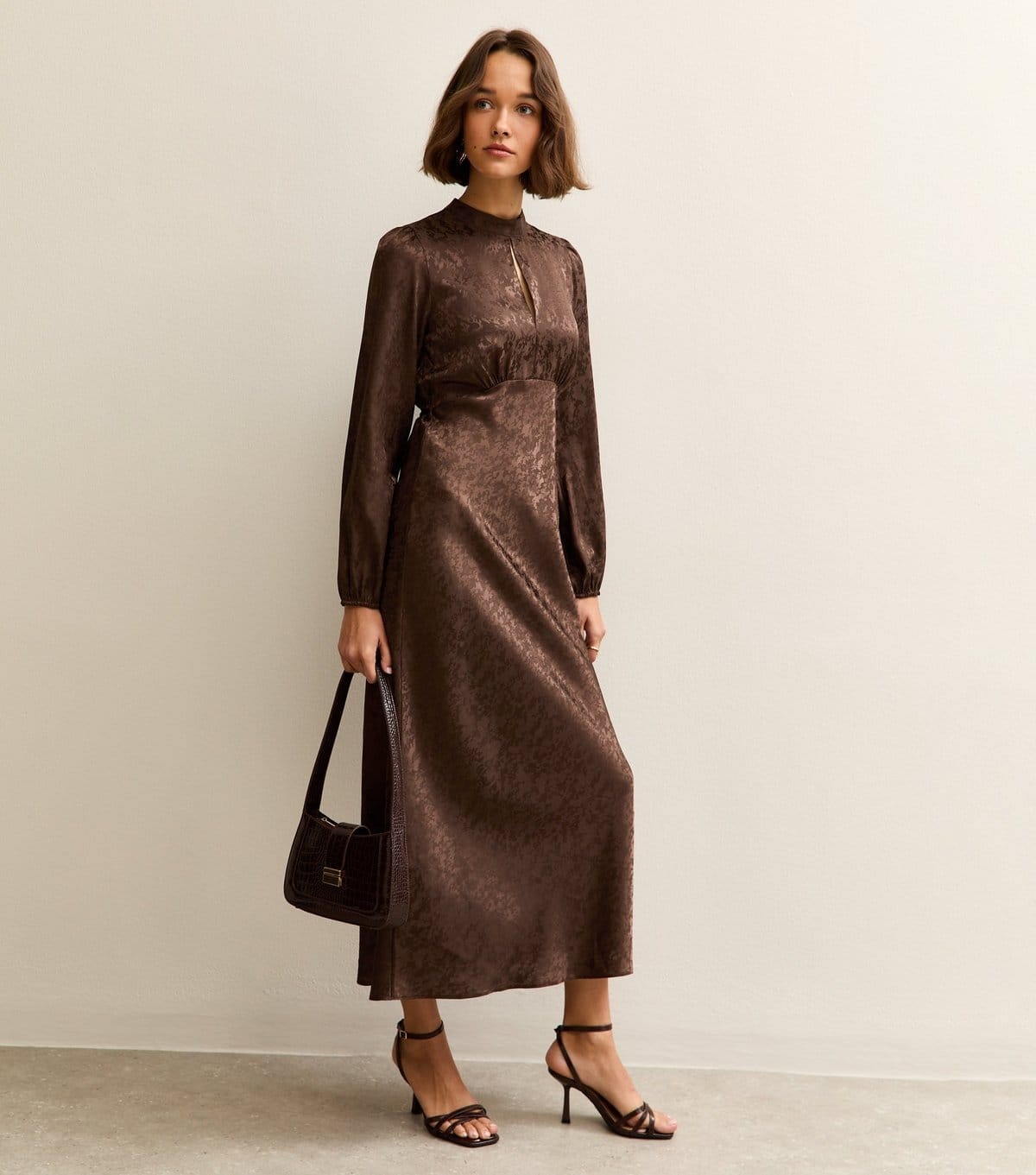 This brown satin jacquard dress skims your figure and flows to a midi length. Featuring a high keyhole neckline and a tonal jacquard-woven pattern, it can be nipped in at the back of the waist.