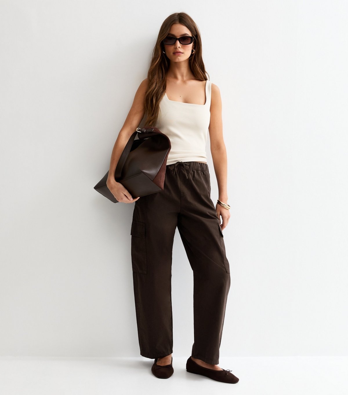 The New Look Dark Brown Barrel Leg Cargo Trousers is available in sizes 10, 12, 14, 16, 18, 6, 8.