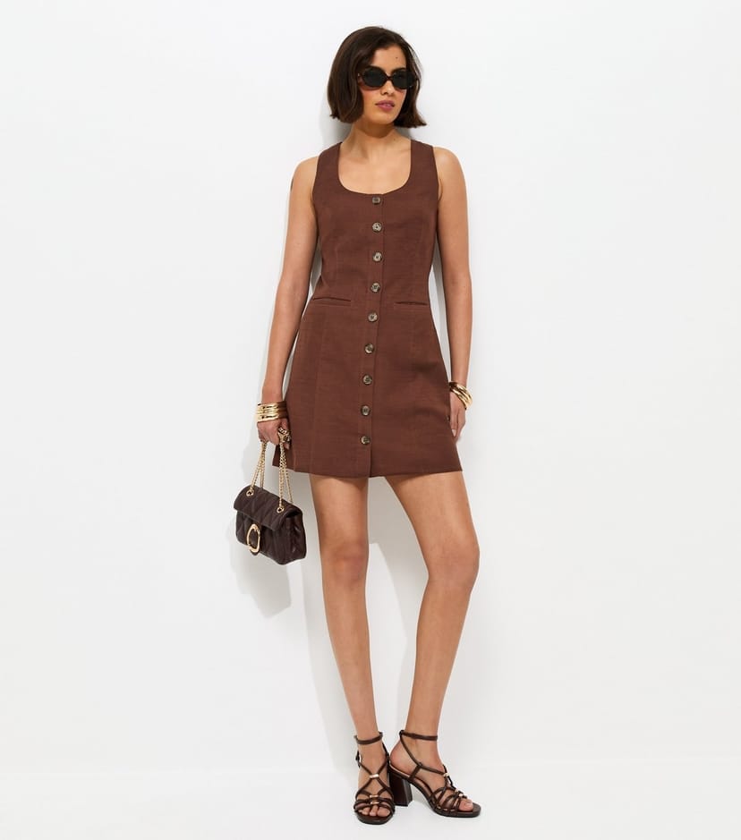 Embrace effortless style with this dark brown mini shift dress. Its scoop neckline and button detailing make it perfect for easy daytime wear.