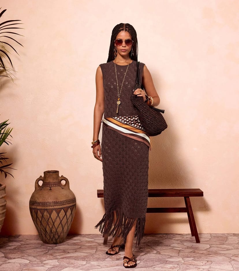 The New Look Dark Brown Crochet Fringe Hem Maxi Dress is ideal for beach, casual, outings.
