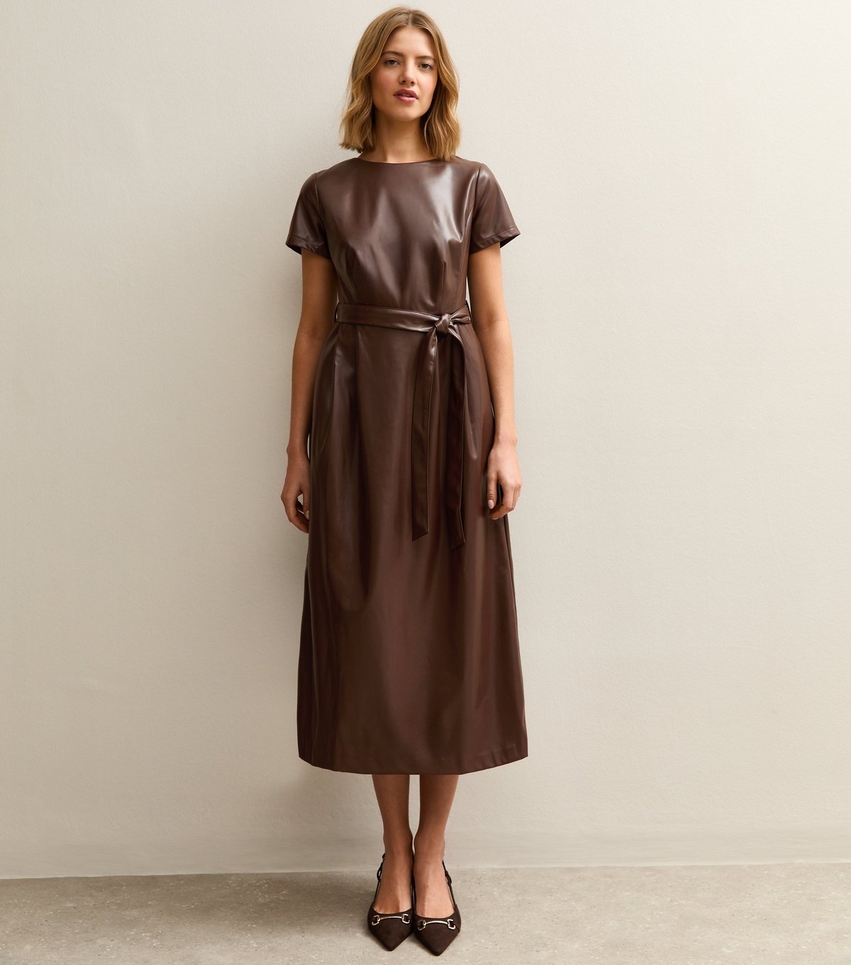 The New Look Dark Brown Faux Leather Belted Midi Dress is available in sizes 6, 8.