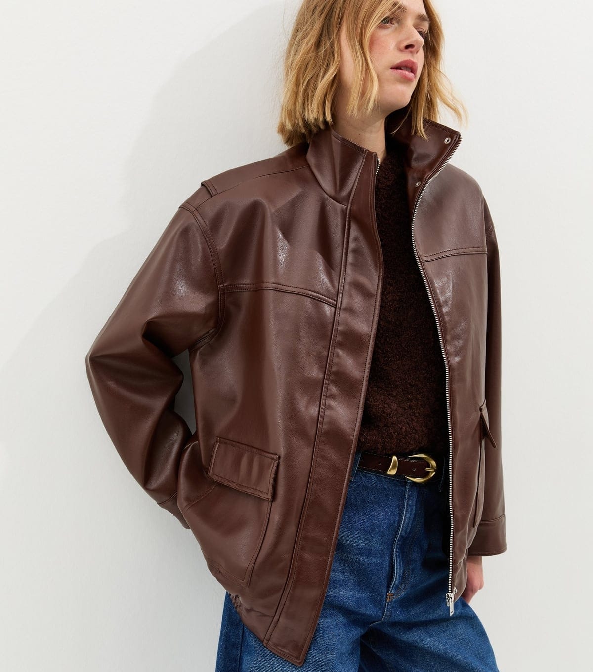The New Look Dark Brown Faux Leather Funnel Neck Jacket is ideal for casual, smart-casual, everyday.