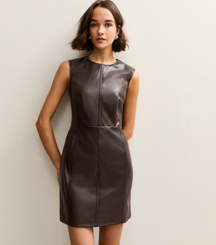 The New Look Dark Brown Faux Leather Sleeveless Mini Dress is available in sizes 12, 14, 16, 18.