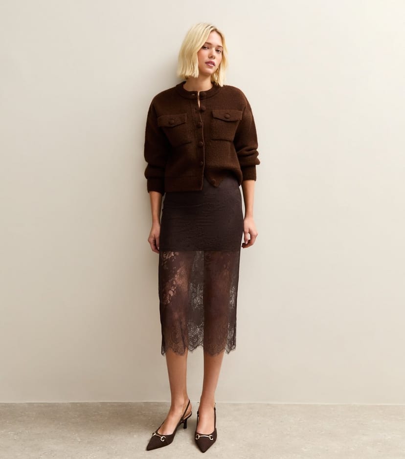 The New Look Dark Brown Lace Midi Skirt is available in sizes 16.