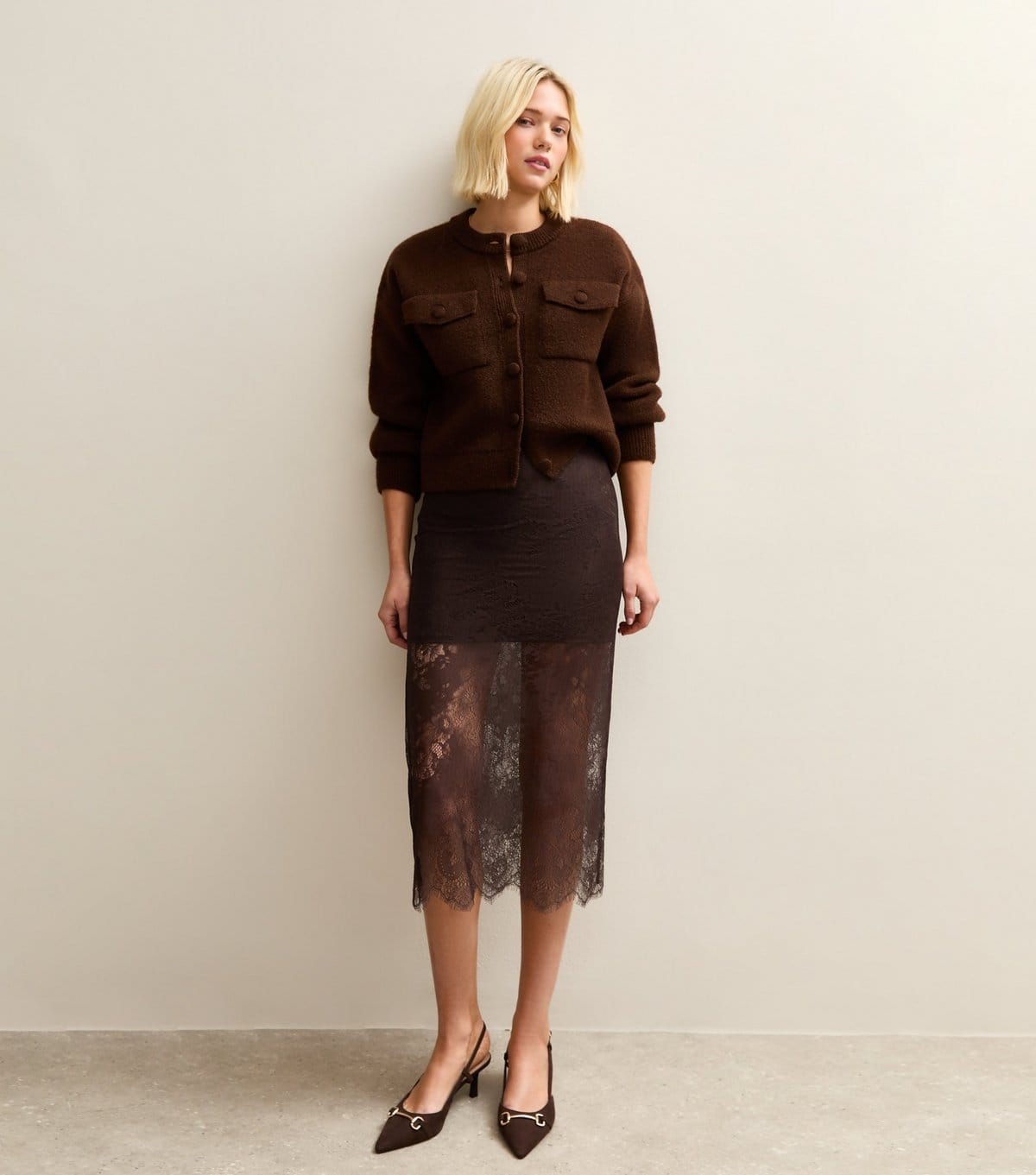 Pair with a brown cardigan and brown pointed-toe heels for a cohesive look.