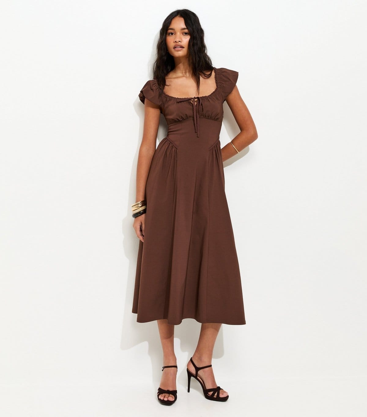 See all outfit ideasFlattering milkmaid midi dress in dark brown with a scooped square neckline and Belgian lace trims. Perfect for both casual and formal occasions.