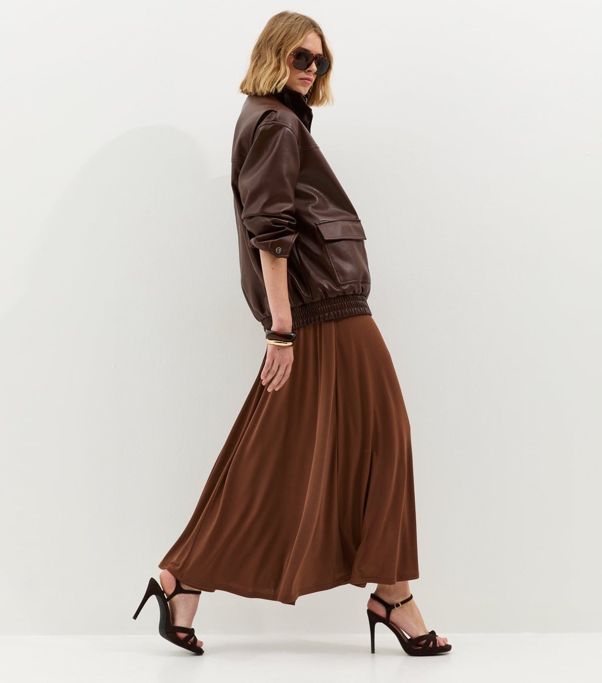 This midweight jersey full skirt by New Look features a full shape and midi length. The dark brown skirt has a comfy elasticated high-rise waist for a flattering fit.