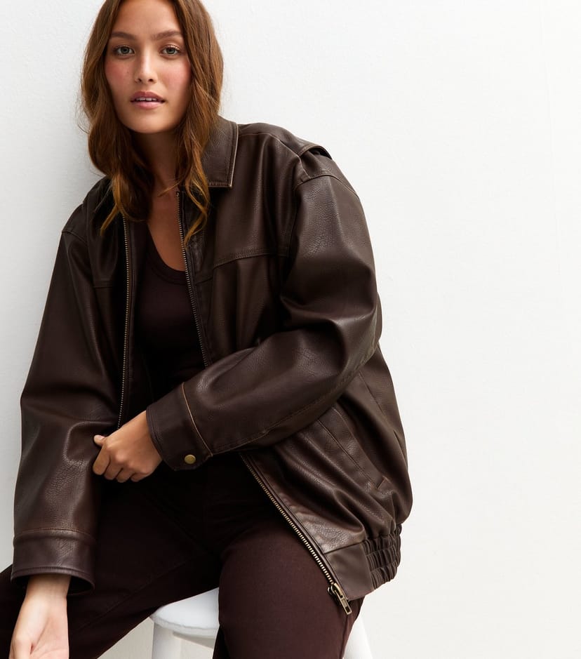 The New Look Dark Brown Oversized Faux Leather Jacket is available in sizes 10, 12, 14, 16, 18.
