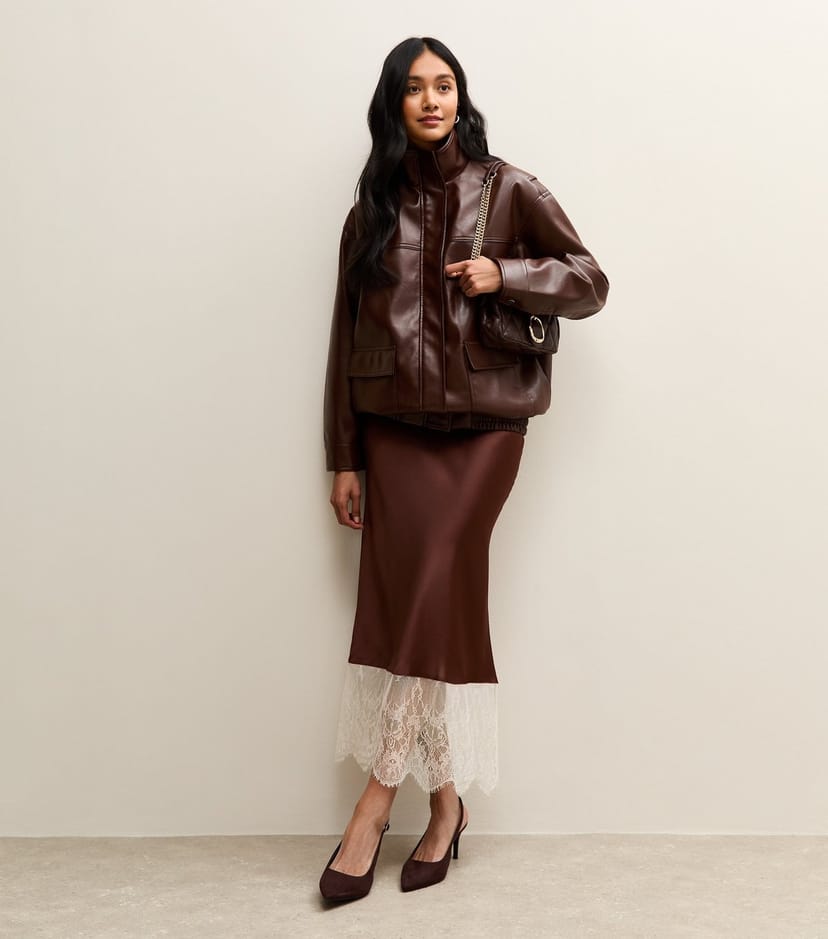 The New Look Dark Brown Satin Lace Hem Midi Skirt is ideal for evening, date-night, party.