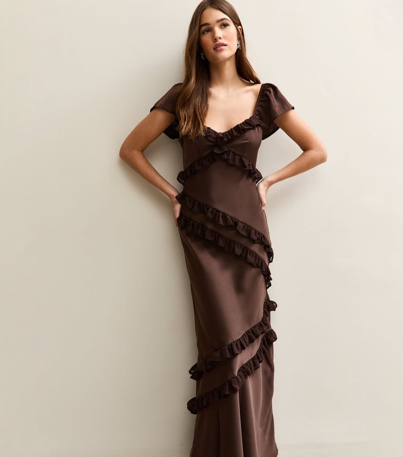 The New Look Dark Brown Satin Midi Dress with Ruffles is available in sizes 16, 20.
