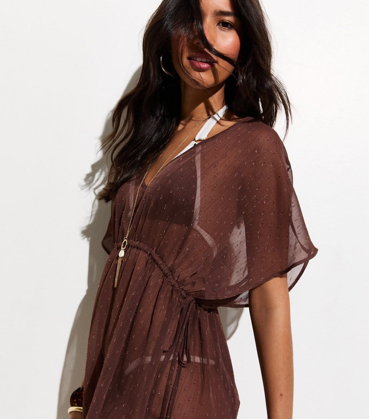 This dark brown sheer sparkly kaftan dress from New Look is perfect for layering after a swim. Featuring a drawstring waist and back neck ties for an adjustable fit, it's crafted from sparkly dobby material. Ideal for beach outings or casual summer wear.