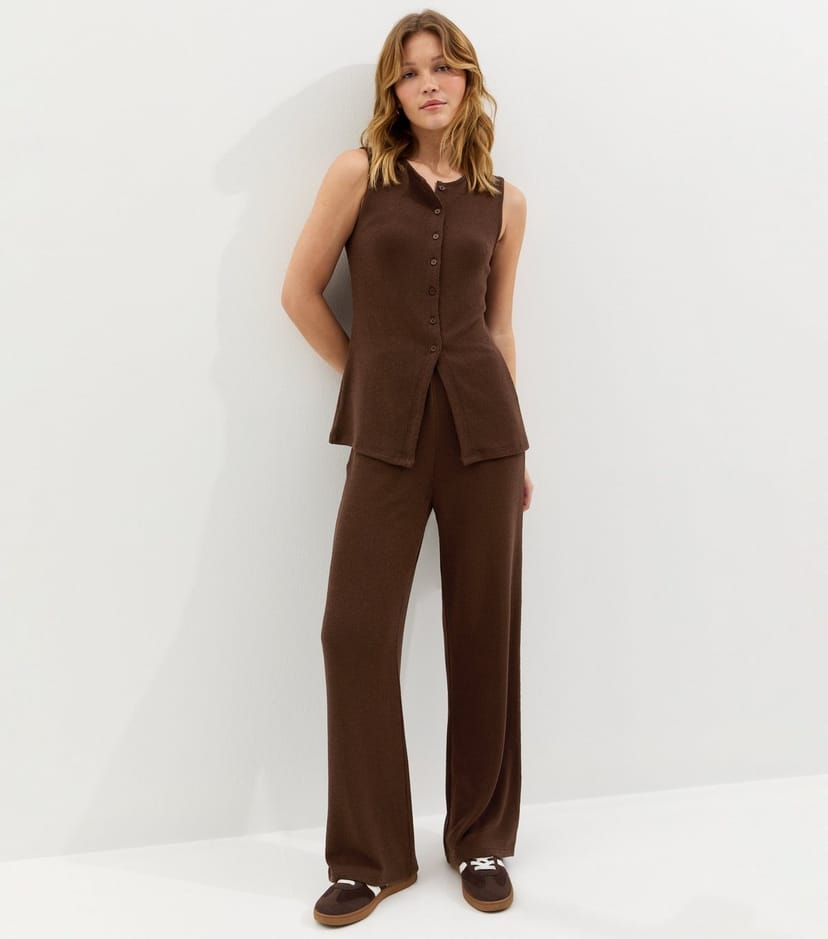 See all outfit ideasComfortable dark brown textured wide-leg trousers with a stretchy waistband. Perfect for a relaxed everyday look. Pair with the matching button-up top for a chic co-ord.