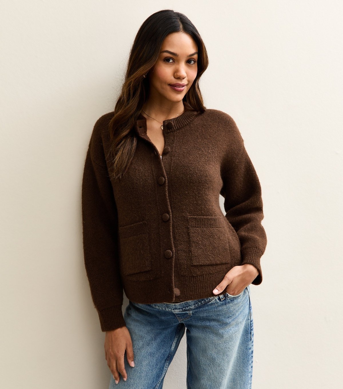 This dark brown cardigan from New Look is perfect for maternity wear. Made from a midweight knit, it features a crew neck and fabric-covered buttons. The double pockets add a practical touch, making it ideal for everyday wear.
