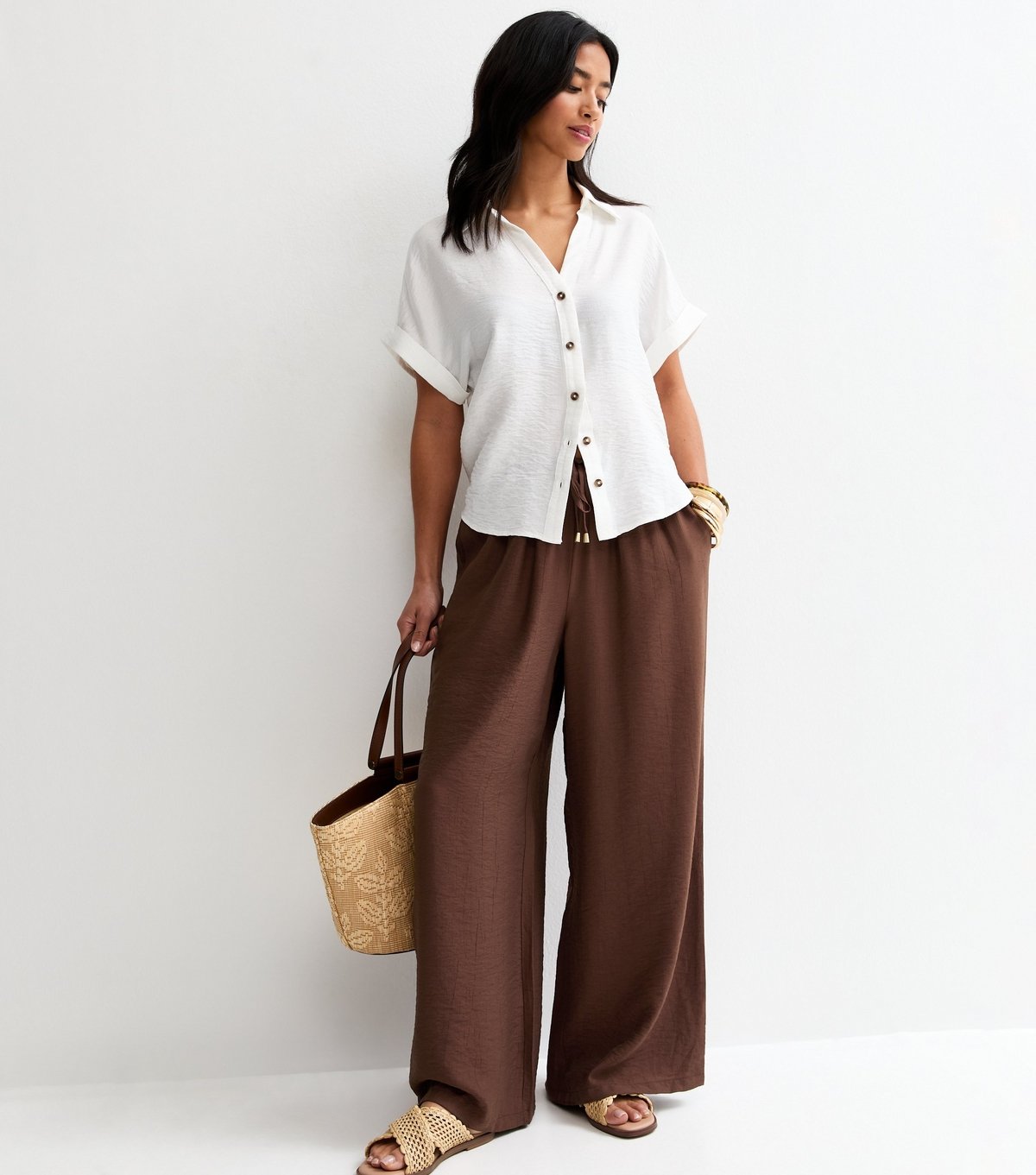 The New Look Dark Brown Crinkle Wide Leg Trousers is made from polyester, cotton.