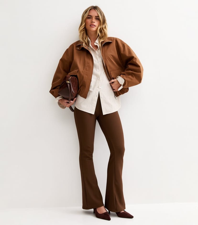 The New Look Dark Brown Ribbed Flare Trousers is made from jersey.