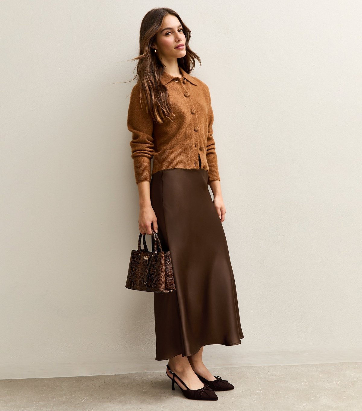 Stylish dark brown satin midi skirt designed for petite frames. This A-line skirt features a bias cut for a flattering fit and includes a comfy elasticised waistband. Ideal for winter wardrobes.