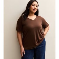Stylish brown jersey V-neck T-shirt by New Look. Designed for plus-size women, this top features a relaxed fit and short sleeves. Ideal for casual wear.