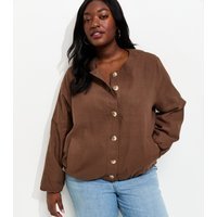 The New Look Dark Brown Linen Bomber Jacket Plus Size is available in sizes 18, 20, 22, 24, 26, 28, 30, 32.