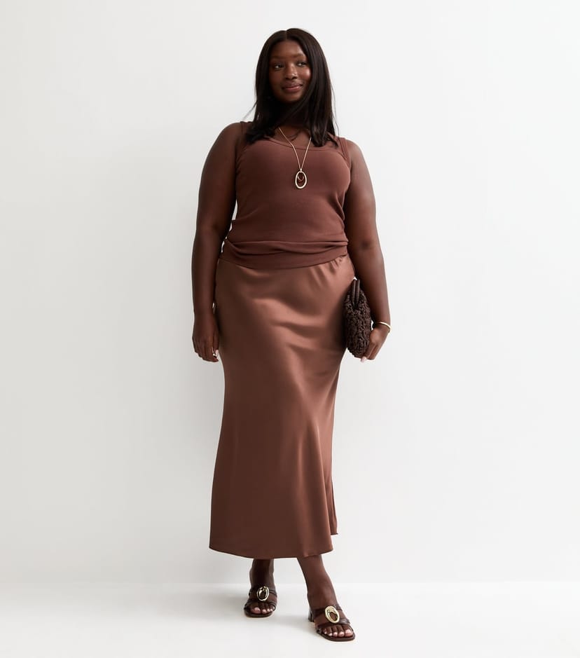 The New Look Dark Brown Satin Midi Skirt Plus Size is made from satin.