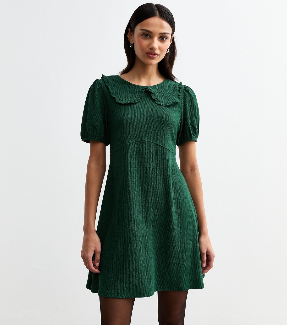 The New Look Dark Green Crinkle Collar Mini Dress is available in sizes 10.