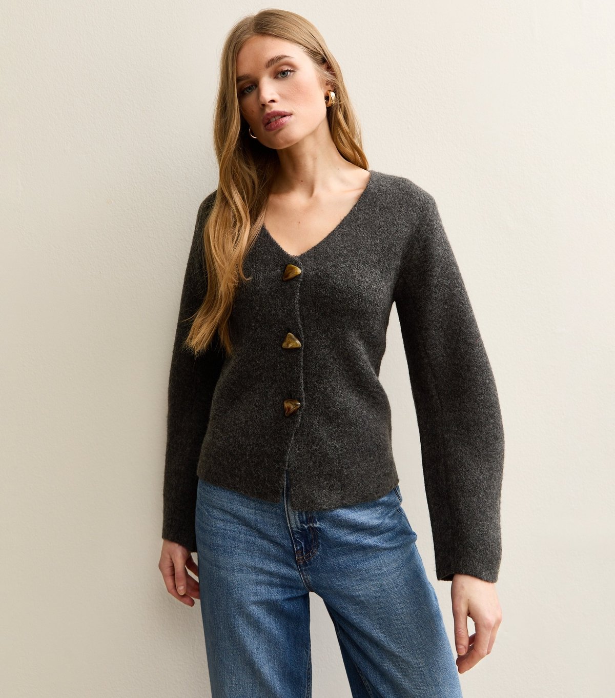 This dark grey cardigan is a cosy button-up style that's perfect for cooler days. The heavyweight knit features angular buttons and long balloon sleeves. Ideal for layering over casual outfits.