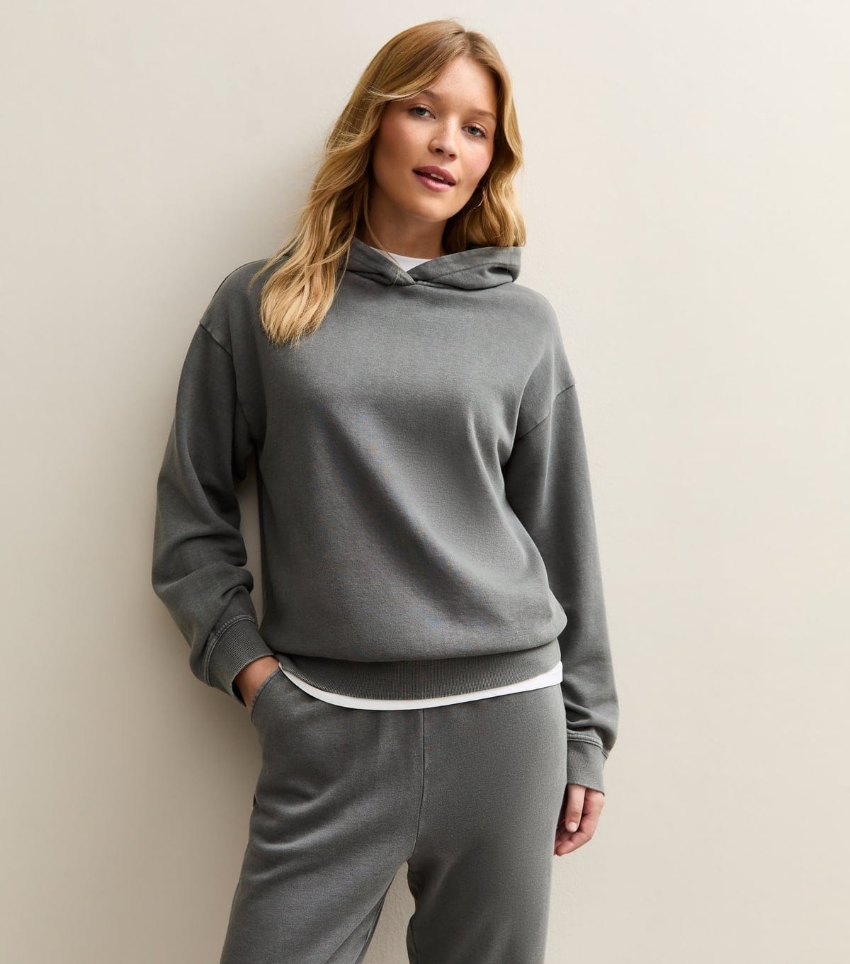 The New Look Dark Grey Washed Jersey Hoodie is made from jersey.
