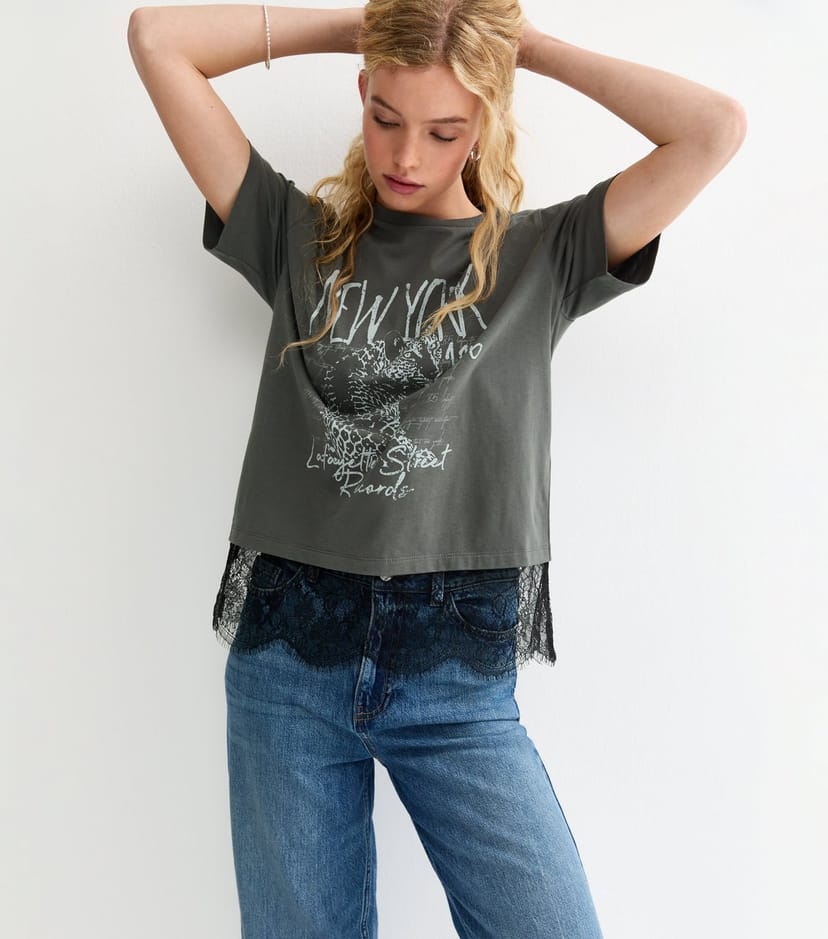 The New Look Dark Grey Leopard Print Lace Trim T-Shirt is ideal for casual, everyday.