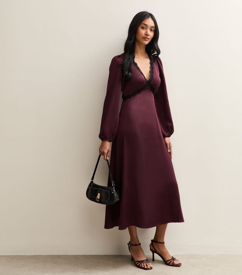 The New Look Dark Purple Satin Lace Trim Midi Dress is ideal for evening, date-night, party.