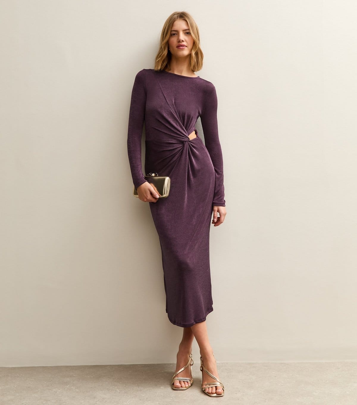See all outfit ideasThis elegant dark purple midi dress is crafted from slinky jersey and features a twisted front knot. Its long sleeves and ruched detailing make it perfect for dressy occasions during the colder months.