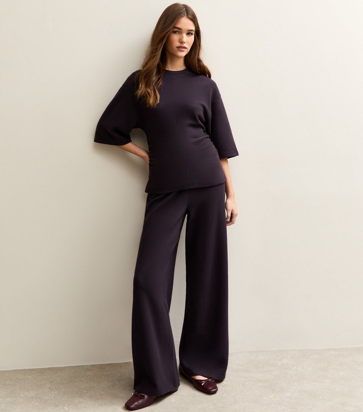 Elegant wide leg trousers in dark purple featuring a soft touch fabric. Ideal for a cozy and stylish look, perfect for casual or work settings.