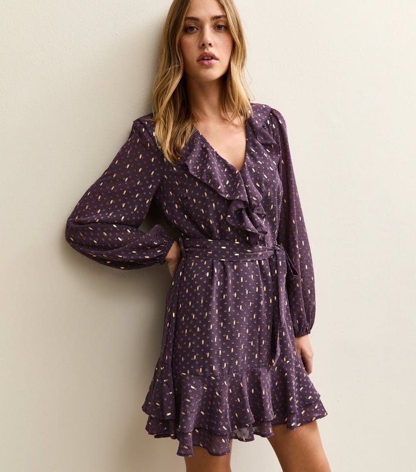 The New Look Dark Purple Spot Chiffon Ruffle Mini Dress is ideal for evening, date-night, party.