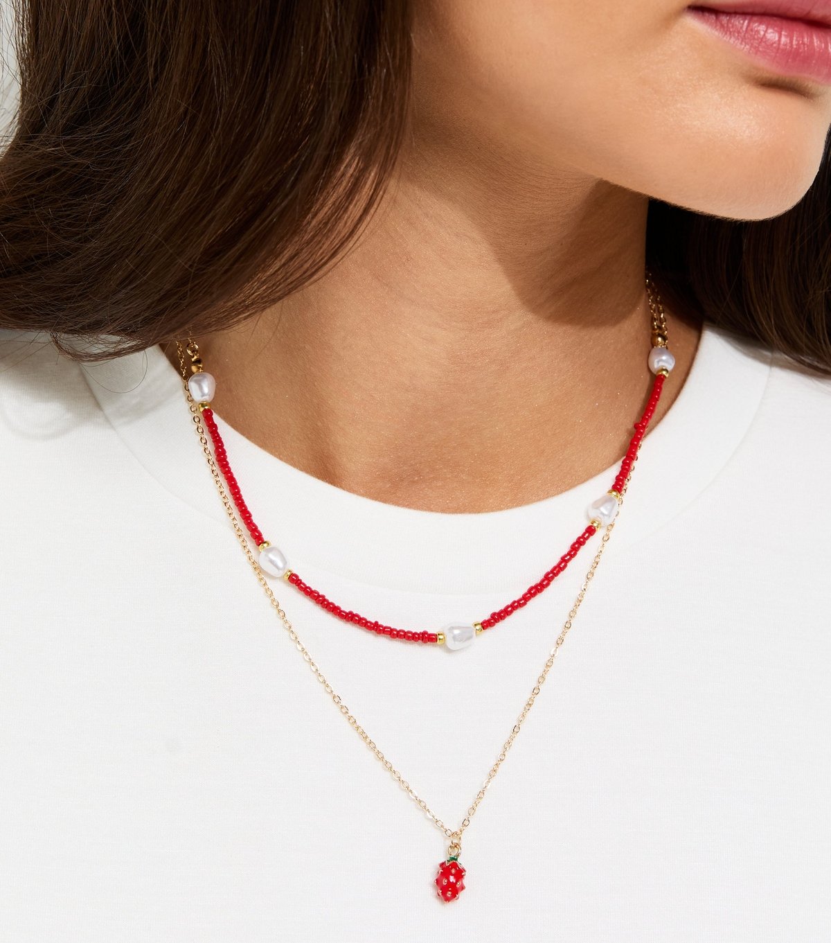 Elegant two-layer necklace from New Look. Features dark pink beads with faux pearls and a gold-tone chain with a charming strawberry charm. A perfect accessory for any occasion.