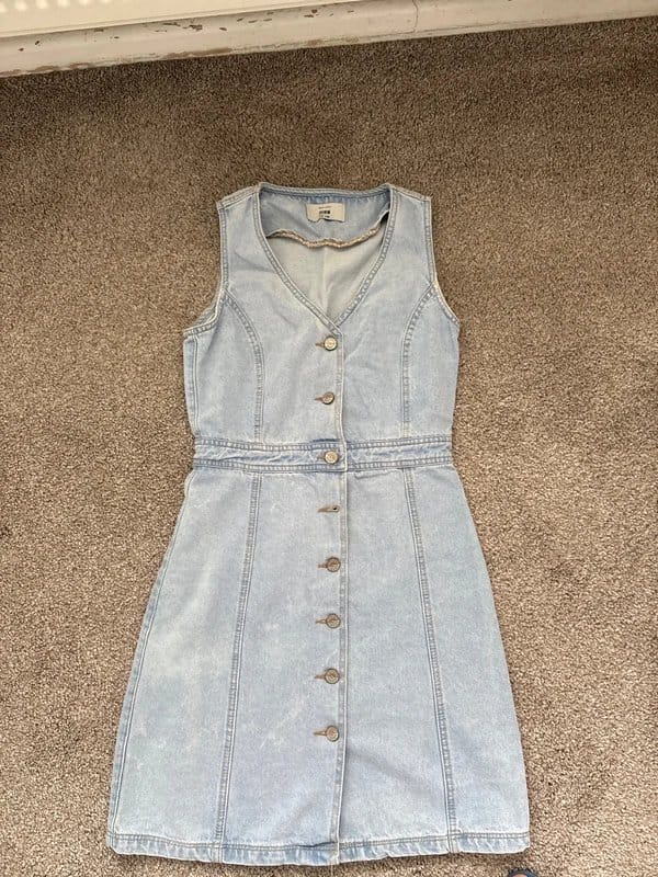 View Vinted's returns policyStylish light blue denim dress from New Look featuring a scoop neckline, button-front, and mini length. Perfect for casual outings or layering over a tee.