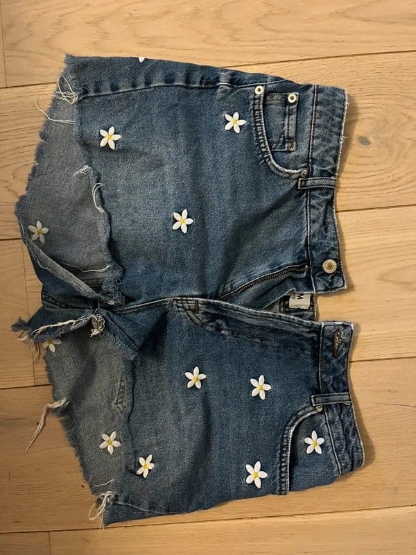 Trendy high-waisted denim shorts adorned with charming daisy embroidery. Crafted from durable denim fabric, these shorts offer a perfect blend of style and comfort.