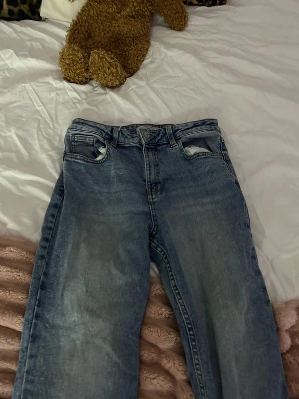 Stylish New Look flared jeans in a classic blue denim finish. Featuring a relaxed fit and distressed detailing for a trendy look. Perfect for casual outings.